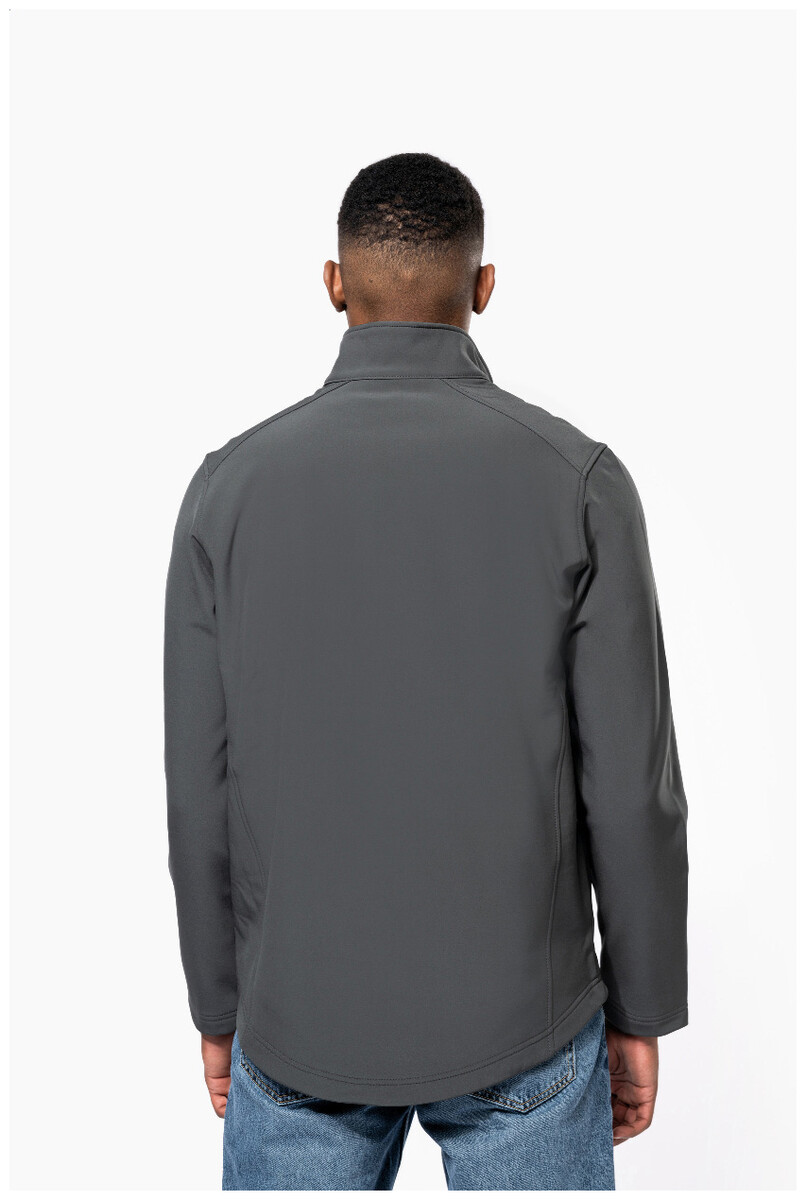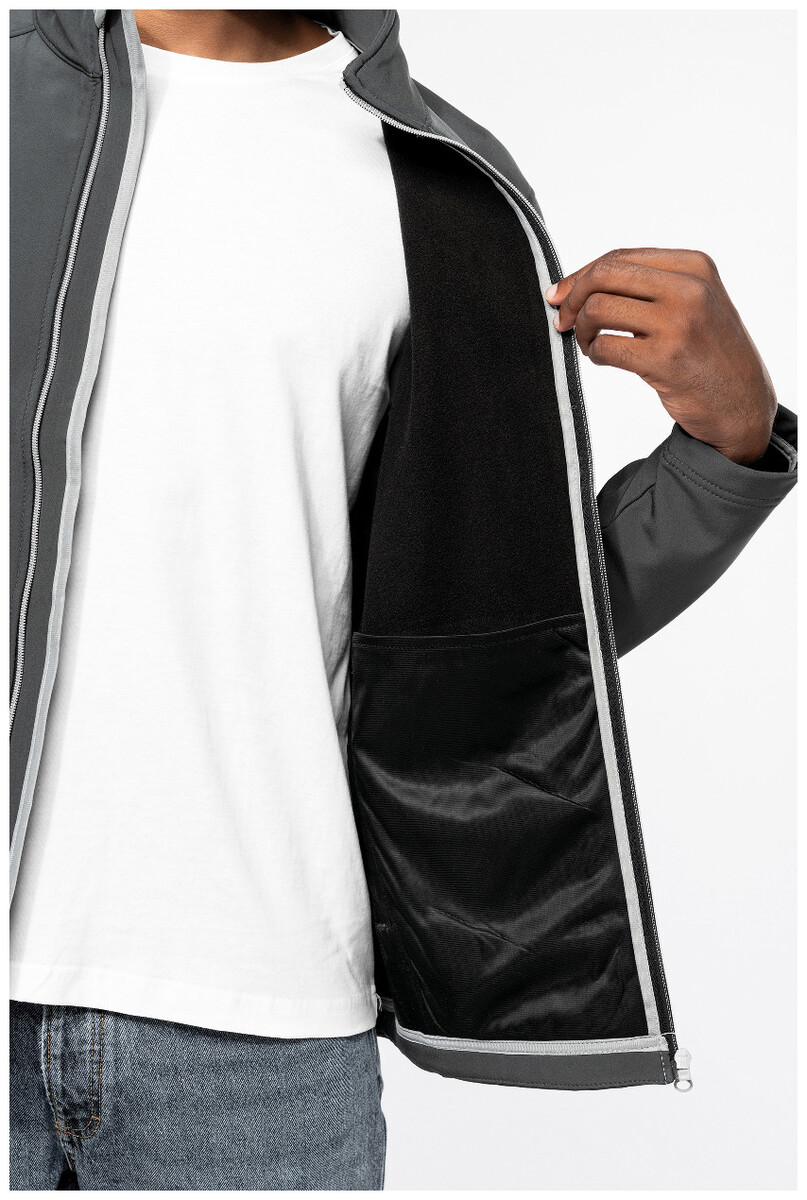 Dvouvrstvá softshellová bunda na zip s bočními kapsami na zip. S kontrastními zipy. Vodoodpudivá tkanina. Vnější strana: 95 % polyester a 5 % elastan. Vnitřní strana: 100% polyester micro polar fleece. Materiál: 300 g/m2. Výrobek značky Kariban.