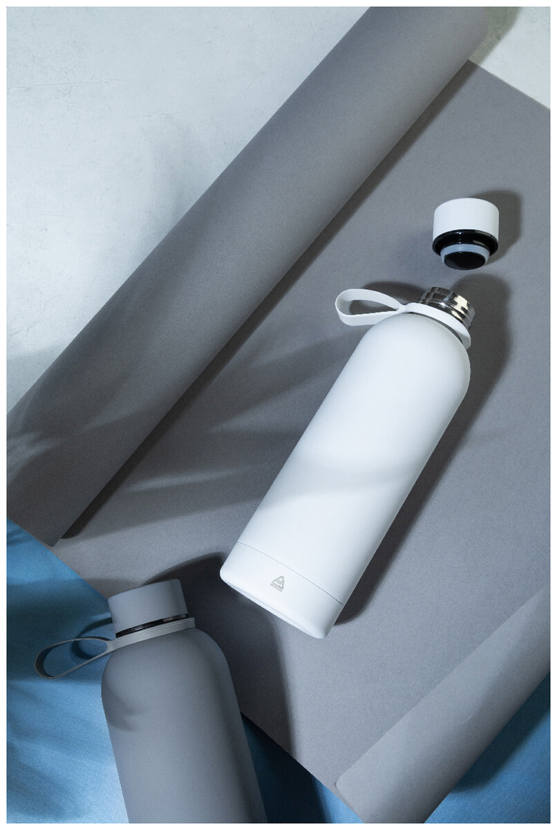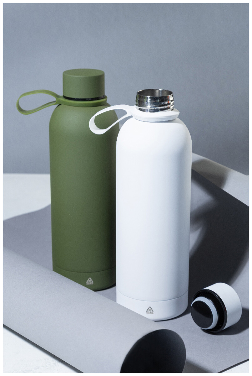 Dvoustěnná vakuová láhev z recyklované nerezové oceli s pogumovanou úpravou a silikonovým páskem, 500 ml.