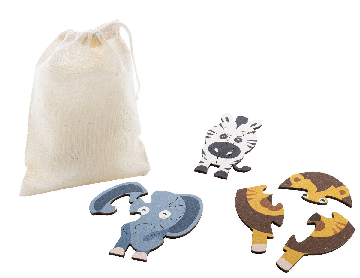 Dětská sada puzzle z březové překližky se 3 tematickými motivy. V bavlněném přepravním pytlíku.