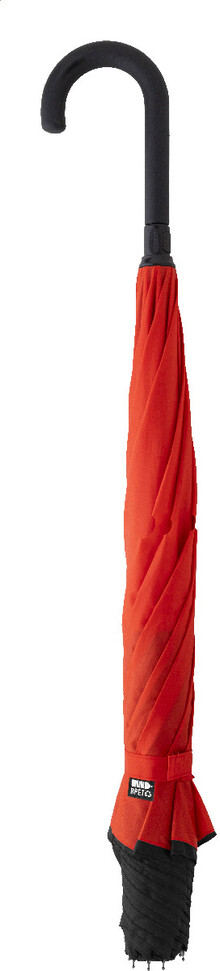 Manuální větruodolný deštník s reverzním otevíráním, 8 panely, dvouvrstvou dvoubarevnou stříškou, kovovým rámem, žebry ze skelných vláken a pogumovanou rukojetí. Materiál: 190T RPET pongee. S výrazným štítkem RPET.