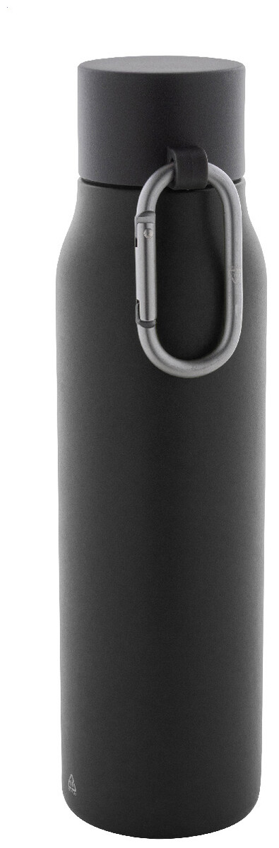 Dvoustěnná vakuová láhev z recyklované nerezové oceli s víčkem z PP a karabinou z recyklovaného hliníku. 500 ml.