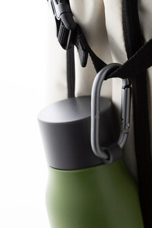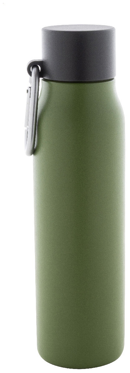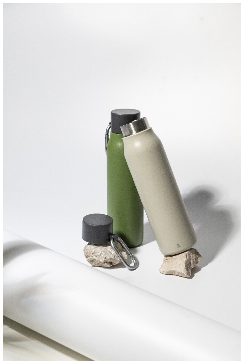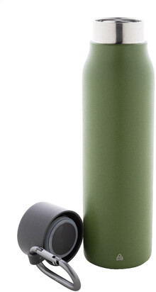 Dvoustěnná vakuová láhev z recyklované nerezové oceli s víčkem z PP a karabinou z recyklovaného hliníku. 500 ml.