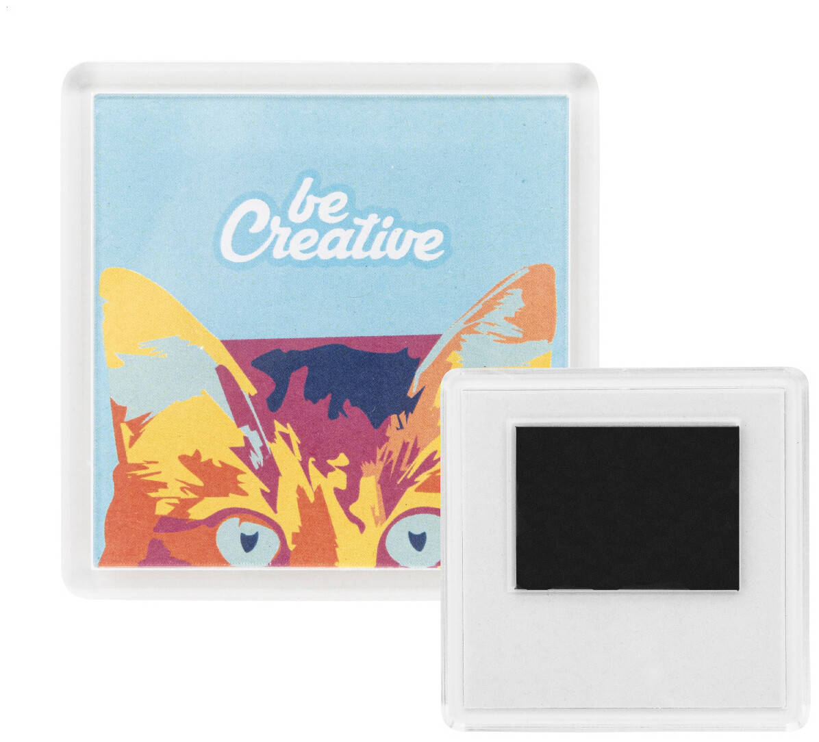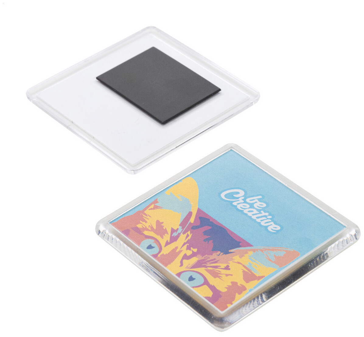 Čtvercový akrylový magnet na ledničku s plnobarevnou papírovou vložkou na zakázku. Cena zahrnuje digitální tisk, cena nezahrnuje tiskovou přípravu. Min. mn.: 100 ks.