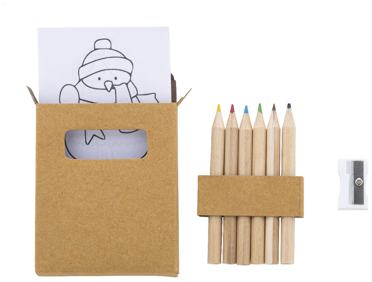 Vánoční sada na vybarvování se 6 dřevěnými pastelkami, ořezávátkem a omalovánkami. V krabičce z kraftového papíru.