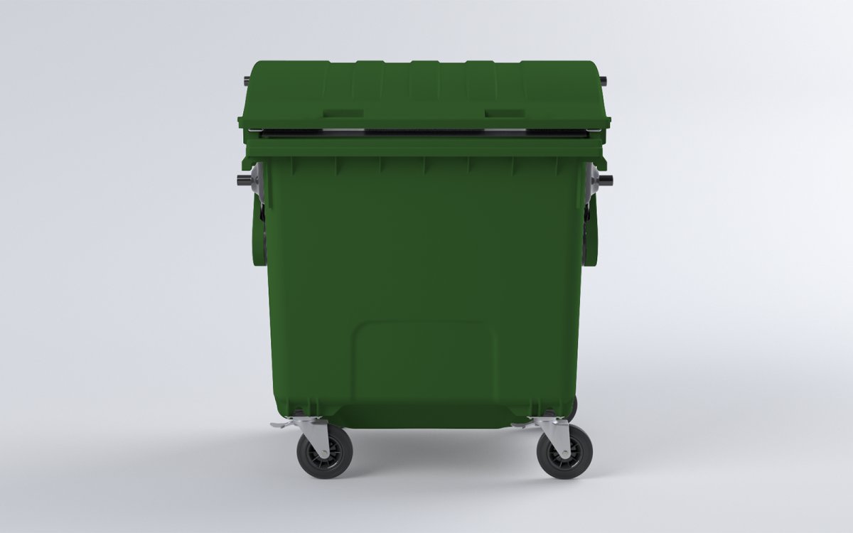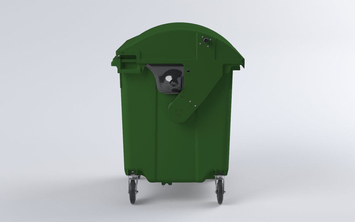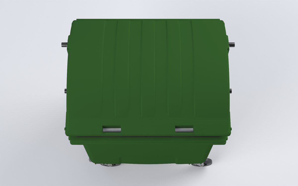 Kontejner s horním výsypem o objemu 1100 litrů je opatřen kulatým víkem.