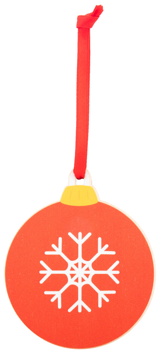 Vánoční ozdoba z březové překližky, s tištěným vánočním designem a červenou stužkou, která je dodávána zvlášť.