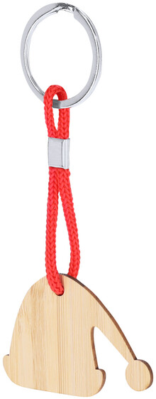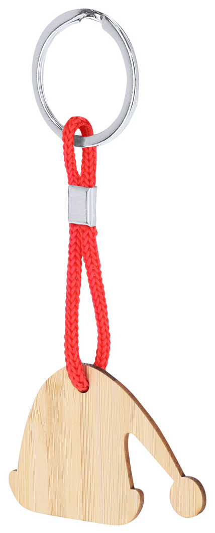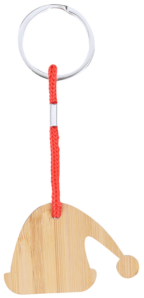Vánoční přívěšek na klíče z bambusové překližky s červeným provázkem a kovovým kroužkem.
