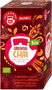 Jemný bio kořeněný čaj Teekanne Bio Organics Oriental Chai nabízí lahodně pikantní chuť se zázvorem, kardamomem a skořicí, která povzbuzuje vaše smysly a přináší orientální zážitek.