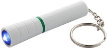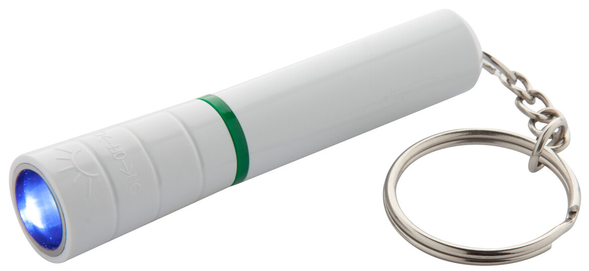 Plastová mini baterka s 1 LED a kovovým kroužkem na klíče. S knoflíkovou baterií.