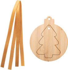 Vánoční ozdoba 2v1 z bambusové překližky se zlatou stuhou. Dodáváno s oddělenou stuhou.
