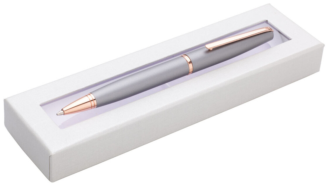 kovová propiska v dárkové krabičce s průhledným okénkem.
