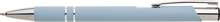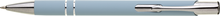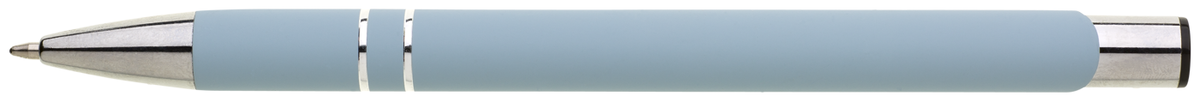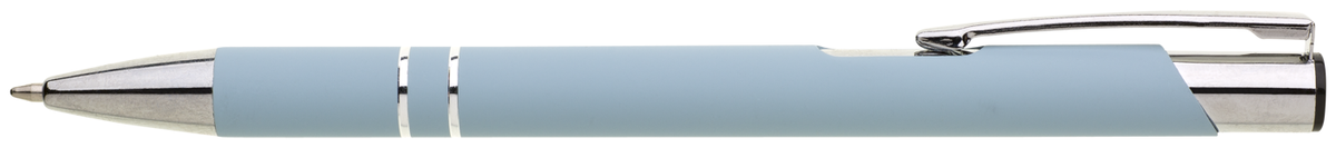 Hliníková propiska se stříbrnými doplňky a měkkým pogumovaným soft povrchemve ve světle modré barvě. Modře píšící.