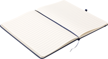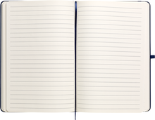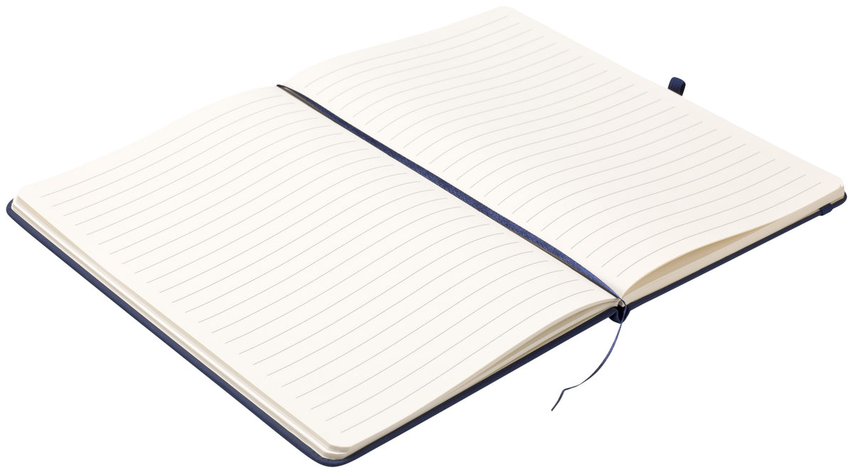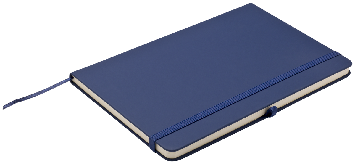Zápisník A5 v modrých deskách z PU materiálu má 80 linkovaných listů. Blok má uzavírací gumičku, poutko na propisku a textilní záložku v barvě desek.
