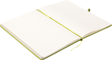 Zápisník A5 v zelených světlých deskách z PU materiálu má 80 linkovaných listů. Blok má uzavírací gumičku, poutko na propisku a textilní záložku v barvě desek.