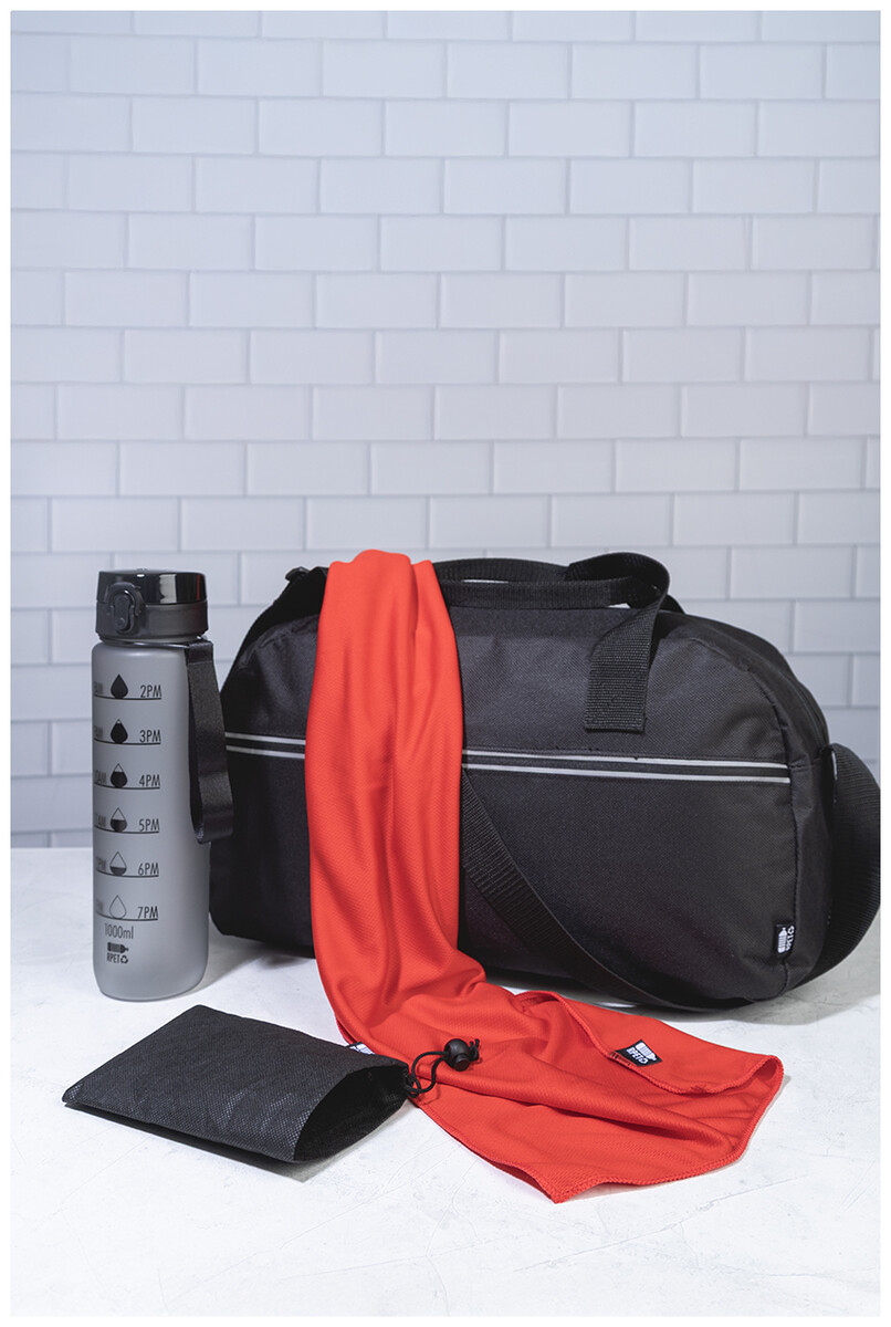Sportovní ručník z mikrovlákna RPET v přepravním pouzdře z netkané tkaniny RPET s charakteristickou etiketou RPET. Polyester RPET, 140 g/m2.