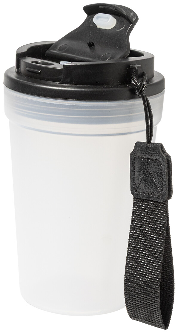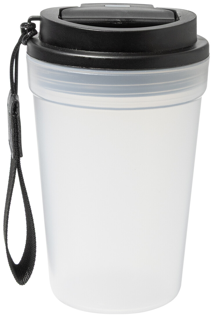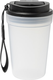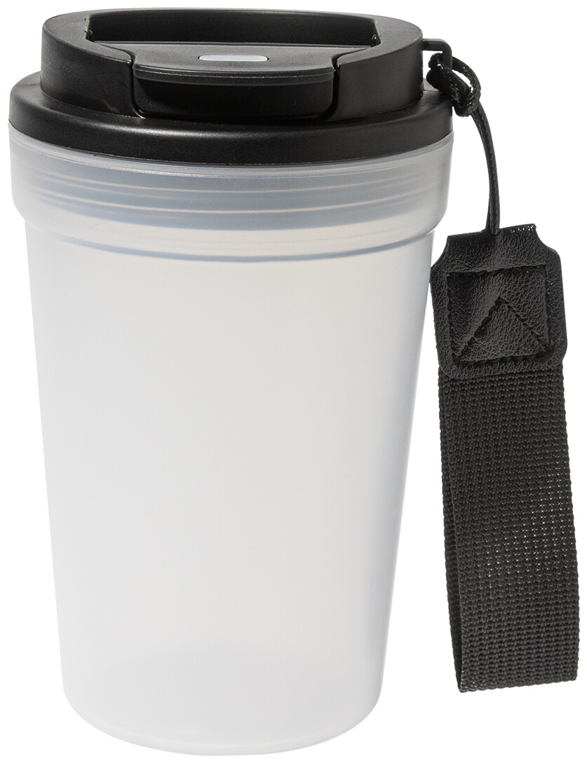 Jednostěnný cestovní kelímek z PP plastu s matnou povrchovou úpravou, víčkem na pití a poutkem z RPET polyesteru. 400 ml.