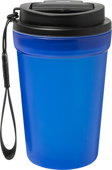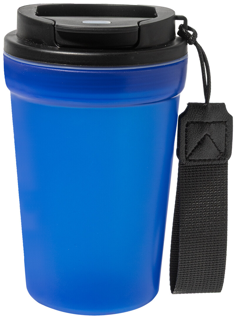 Jednostěnný cestovní kelímek z PP plastu s matnou povrchovou úpravou, víčkem na pití a poutkem z RPET polyesteru. 400 ml.