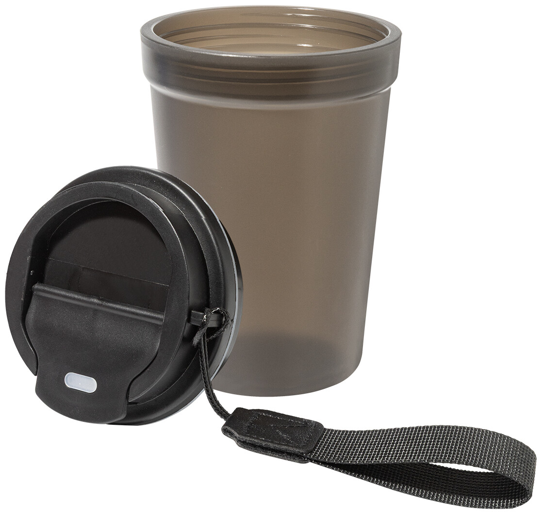 Jednostěnný cestovní kelímek z PP plastu s matnou povrchovou úpravou, víčkem na pití a poutkem z RPET polyesteru. 400 ml.