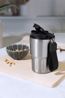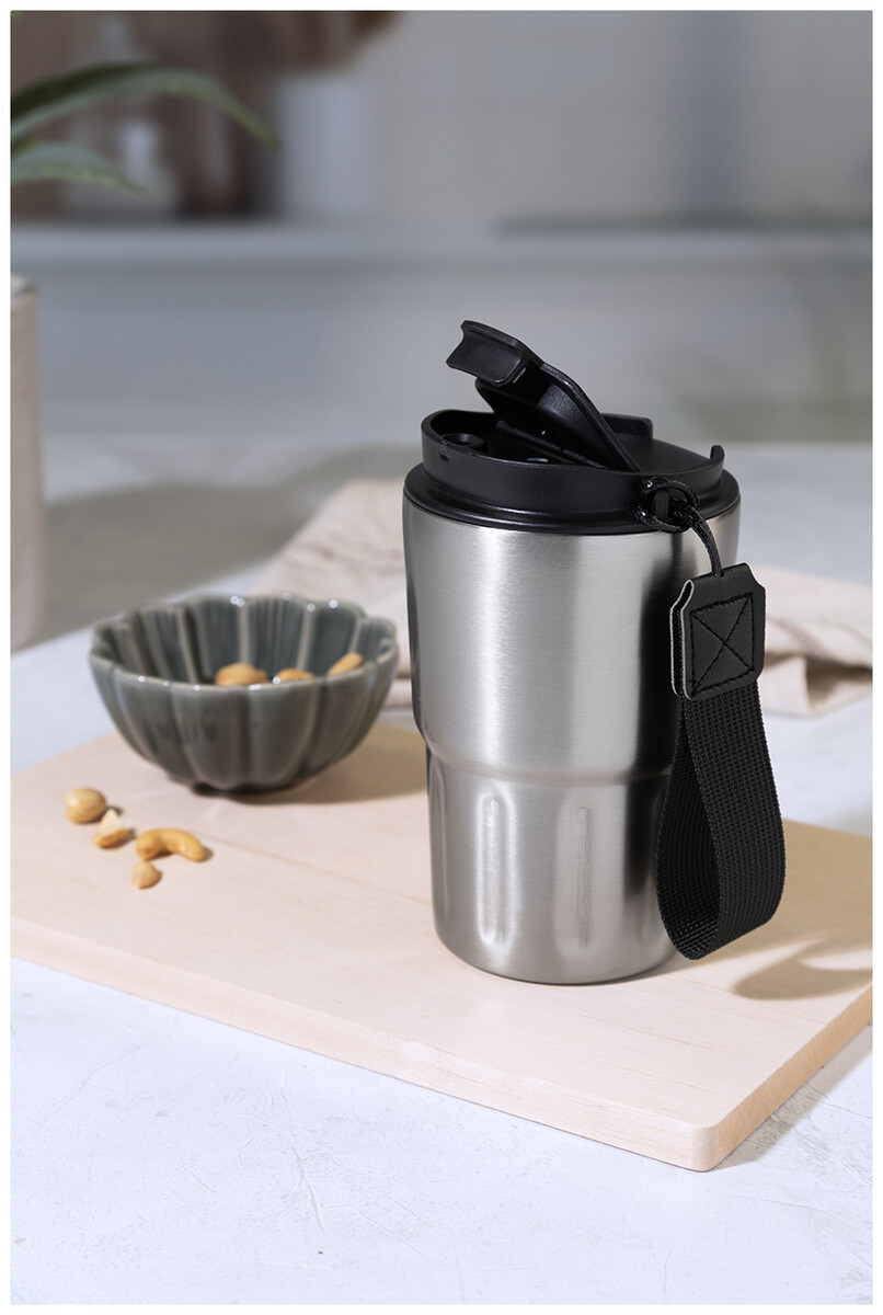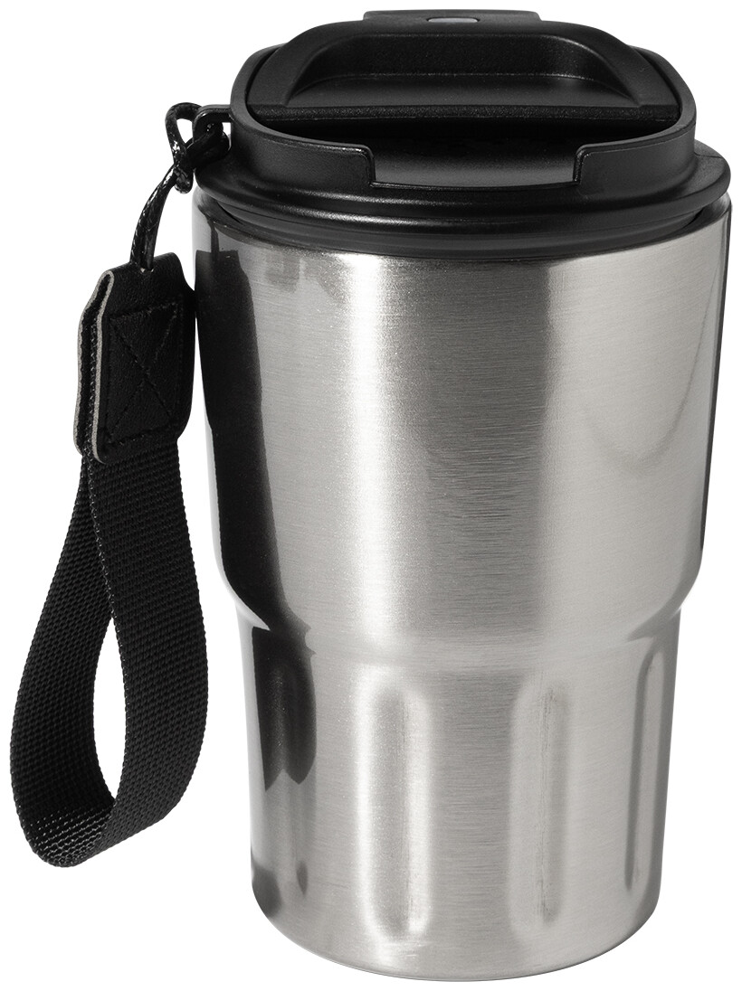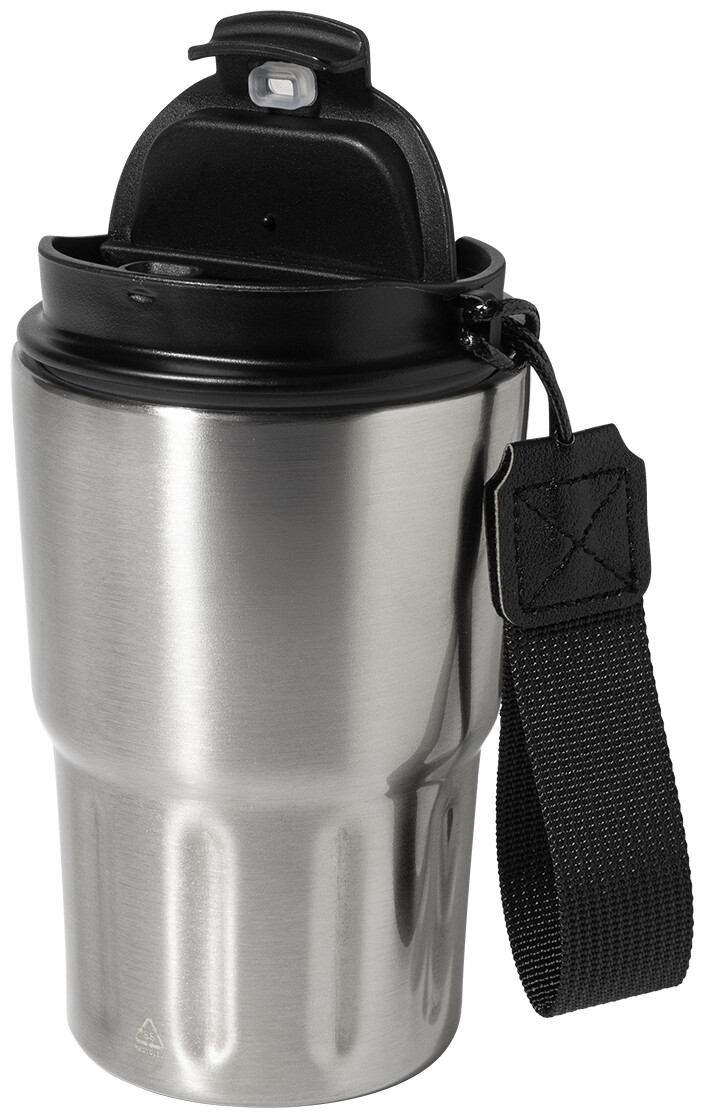 Dvoustěnný termo hrnek z recyklované nerezové oceli s izolačním víčkem z PP. S poutkem z RPET polyesteru. 350 ml.