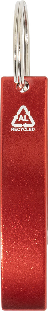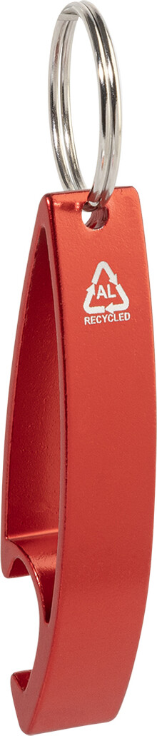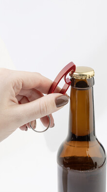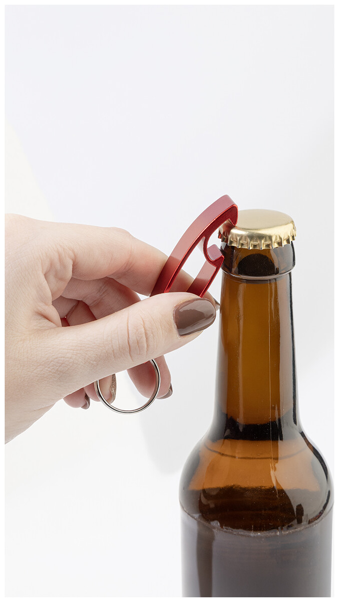 Otvírák na lahve z recyklovaného hliníku s kovovým kroužkem na klíče.