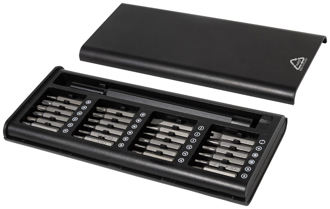 Sada přesných šroubováků s 24 bity v pouzdře z recyklovaného ABS plastu. Rukojeť šroubováku je vybavena magnetickým uchycením bitů pro rychlou a bezpečnou výměnu bitů.