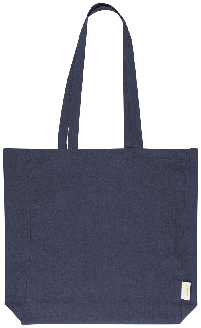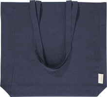 Nákupní taška s klínkem a dlouhými uchy ze 70 % recyklované bavlny a 30 % RPET polyesteru, 140 g/m2. S výraznou etiketou o recyklované bavlně.