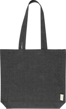 Nákupní taška s klínkem a dlouhými uchy ze 70 % recyklované bavlny a 30 % RPET polyesteru, 140 g/m2. S výraznou etiketou o recyklované bavlně.