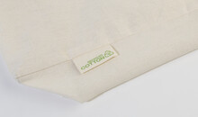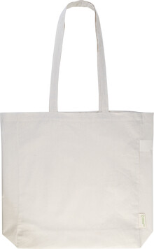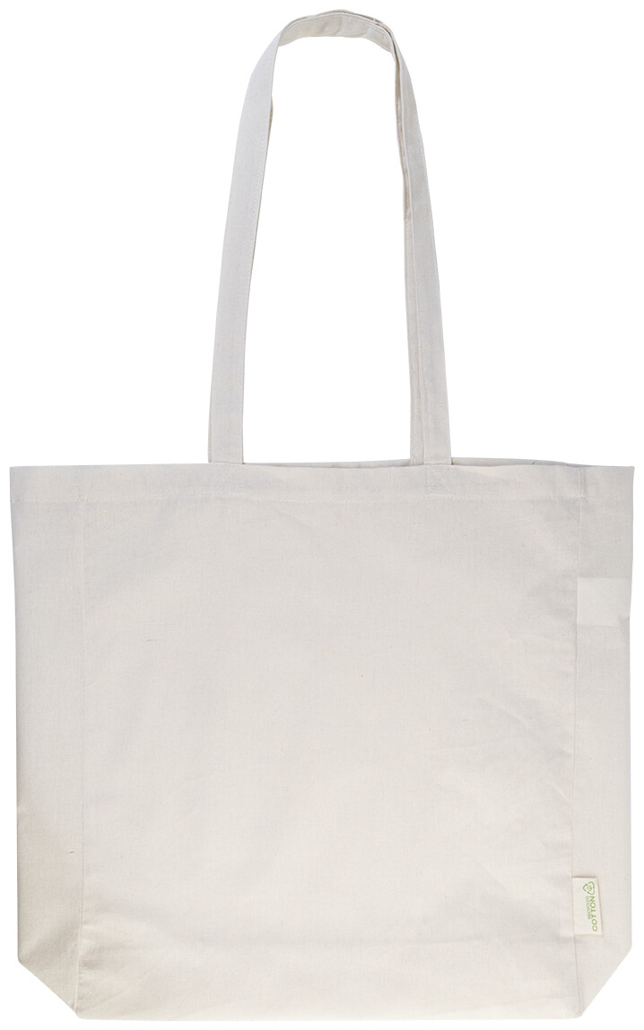 Nákupní taška s klínkem a dlouhými uchy ze 70 % recyklované bavlny a 30 % RPET polyesteru, 140 g/m2. S výraznou etiketou o recyklované bavlně.