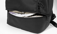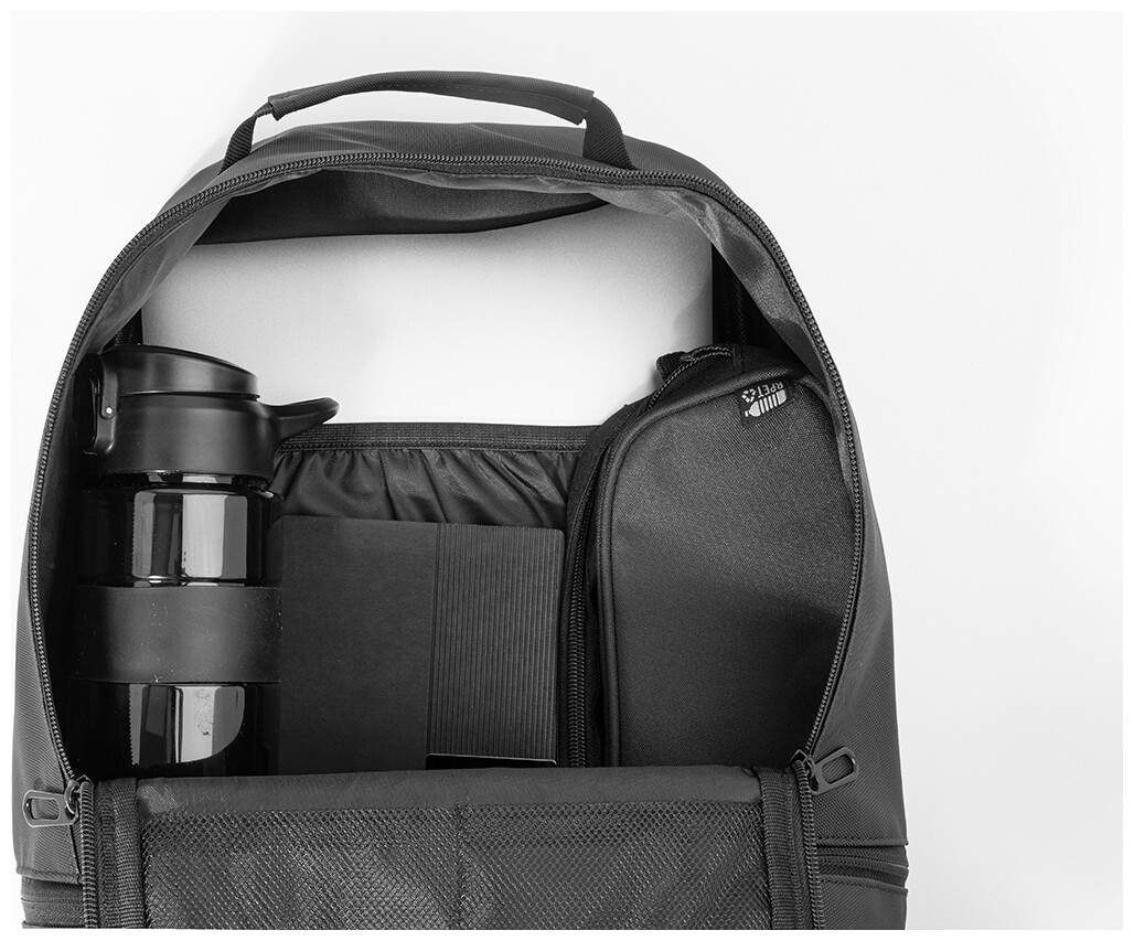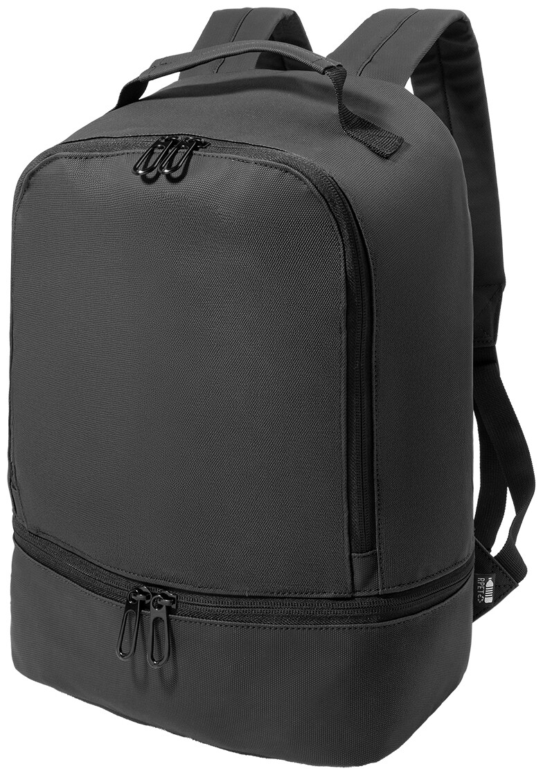 Voděodolný batoh z RPET s hlavní přihrádkou na zip, polstrovanou přihrádkou na notebook (13"), spodní přihrádkou na zip a skrytou boční kapsou. S polstrovanými zády a ramenními popruhy. Polyester 600D RPET s PU zátěrem a výrazným štítkem RPET.
