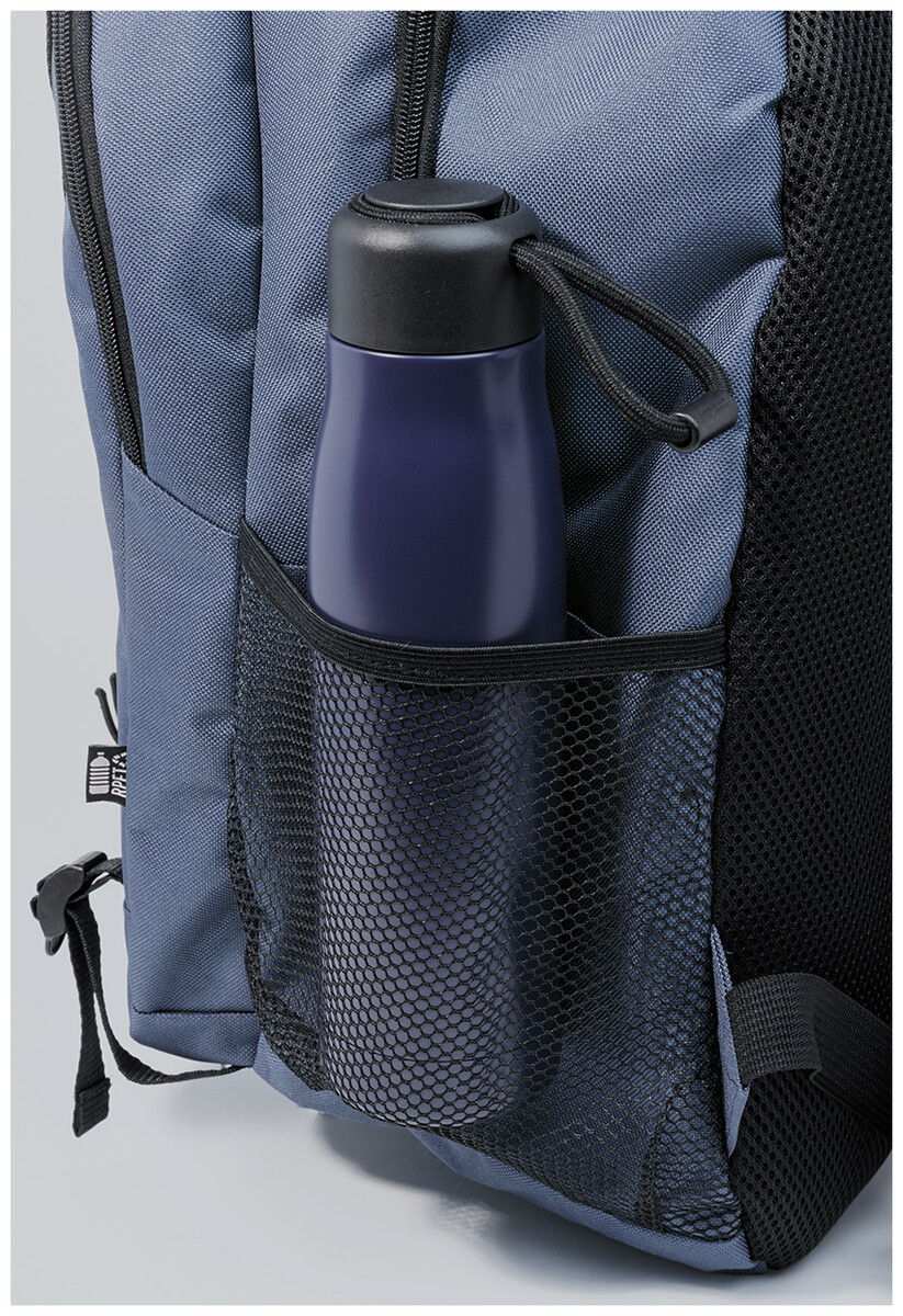 Outdoorový batoh z RPET s přihrádkami na zip a přední kapsou, polstrovanou přihrádkou na notebook (15"), síťovanými bočními kapsami a elastickými šňůrkami vpředu. S polstrovanými zády a ramenními popruhy. Polyester 600D RPET s výrazným štítkem RPET.