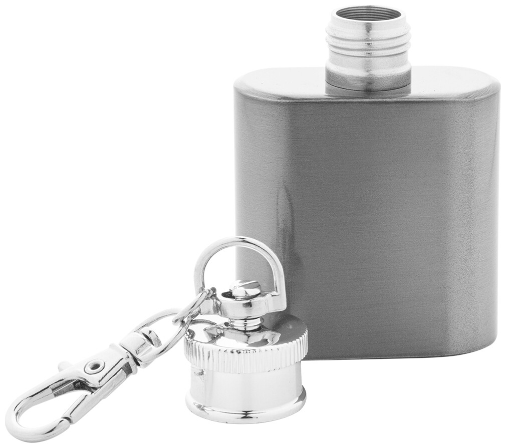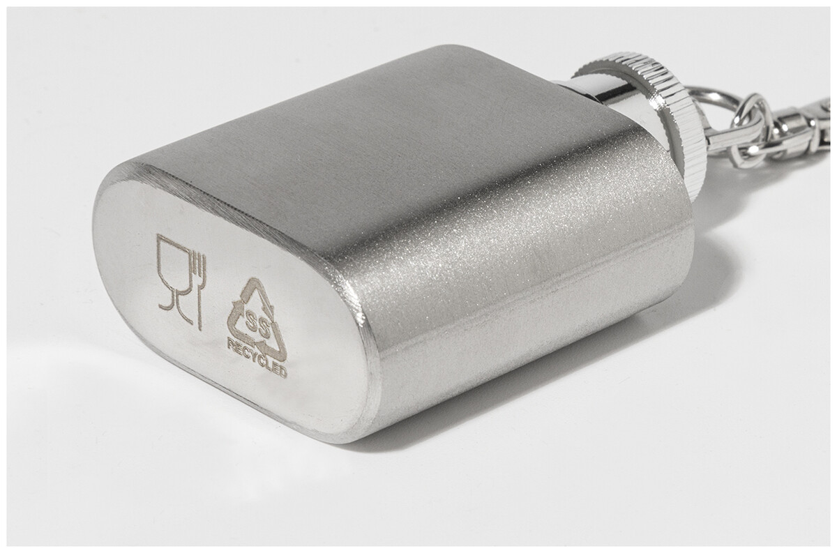 Miniaturní butylka z recyklované nerezové oceli s karabinou na klíče. 30 ml.
