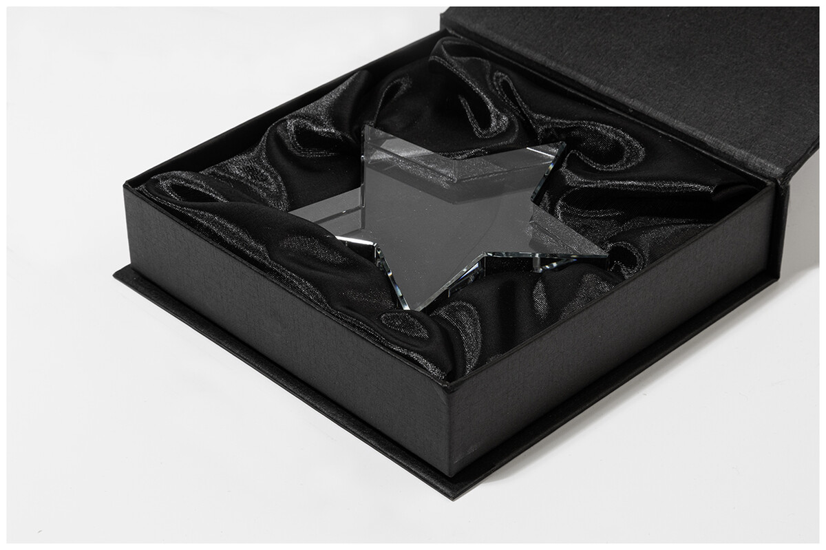 Skleněná trofej ve tvaru hvězdy v černé dárkové krabičce.