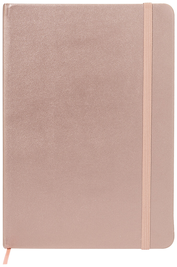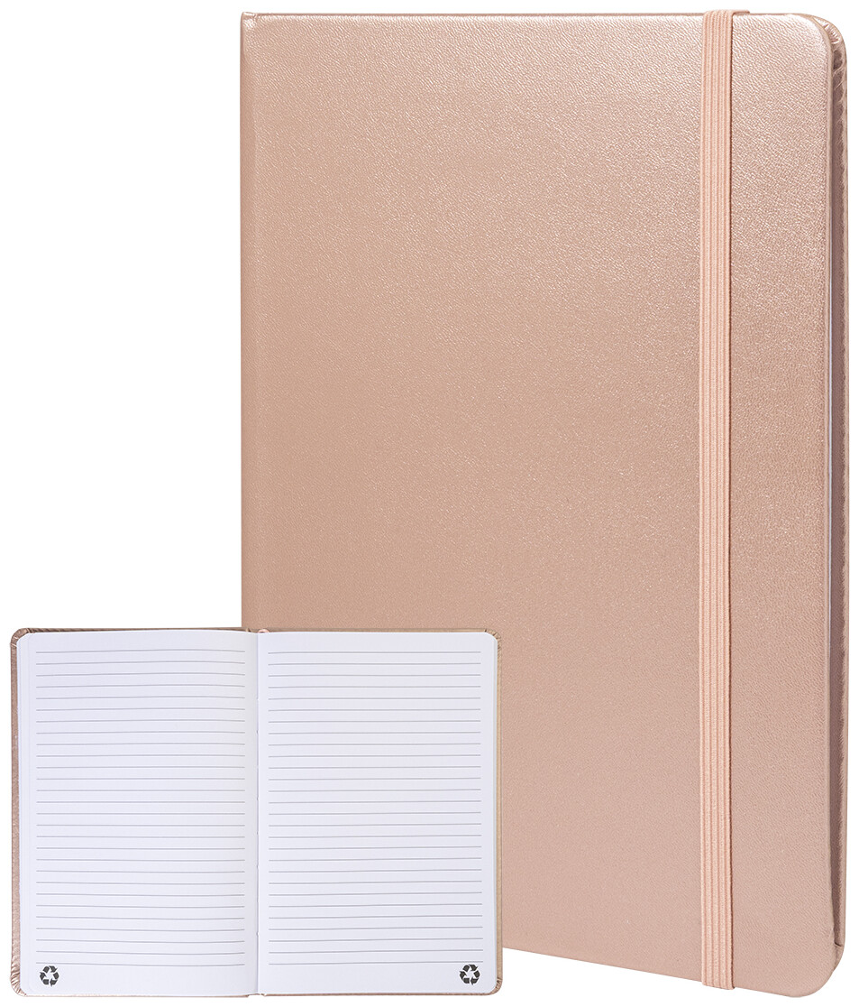 Blok A5 s potahem z recyklované PU kůže s metalickou úpravou se 100 linkovanými listy z recyklovaného papíru. S barevnou záložkou a gumičkou.