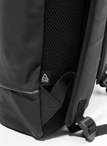 Voděodolný batoh s rolovacím vrškem z měkké recyklované PU kůže s hlavní přihrádkou na zip a zapínáním na přezku, přední kapsou s voděodolným zipem, polstrovanou přihrádkou na notebook (15") a reflexním proužkem. S polstrovanými zády a ramenními popruhy. S výraznou nálepkou z recyklované PU kůže.