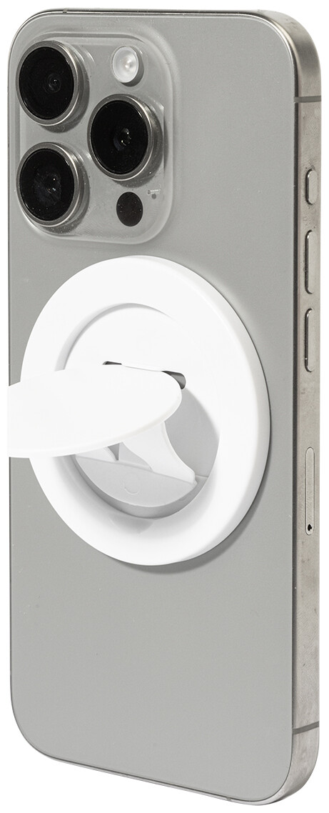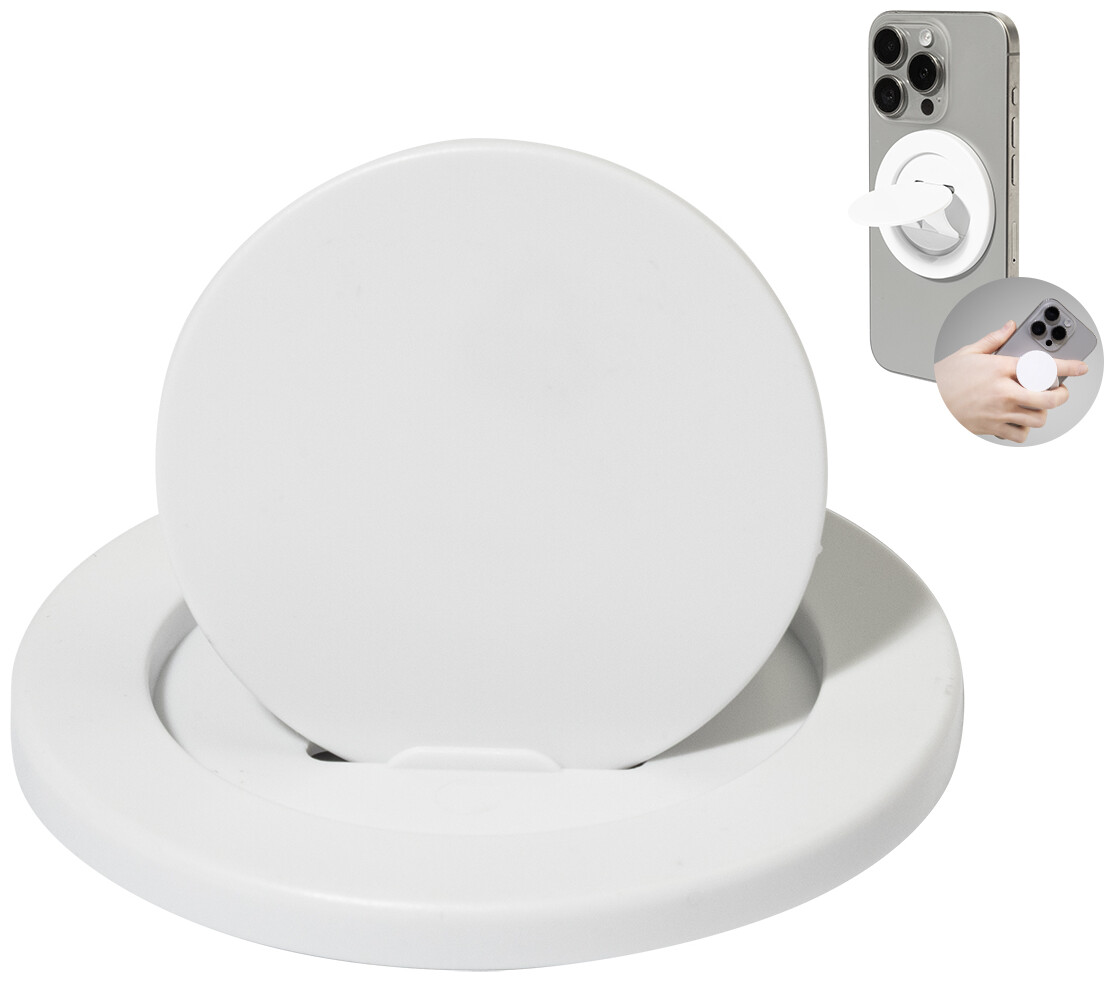 Magnetický držák na mobil z recyklovaného ABS. Včetně samolepicího kovového kroužku pro telefony bez magnetického povrchu.