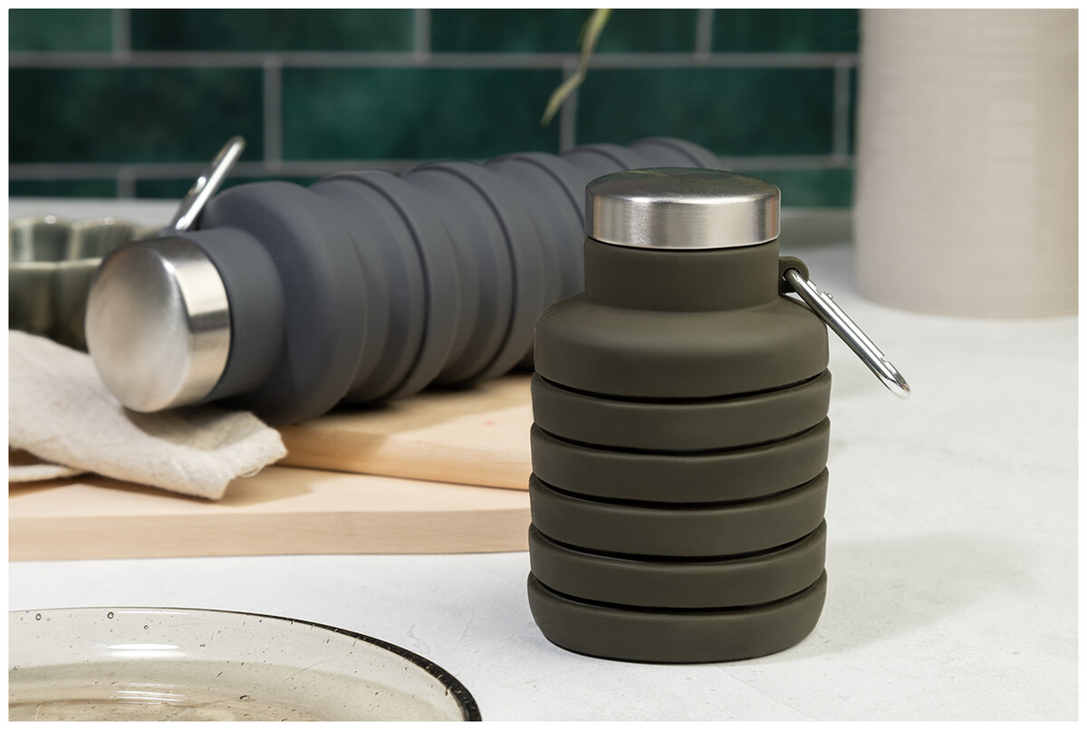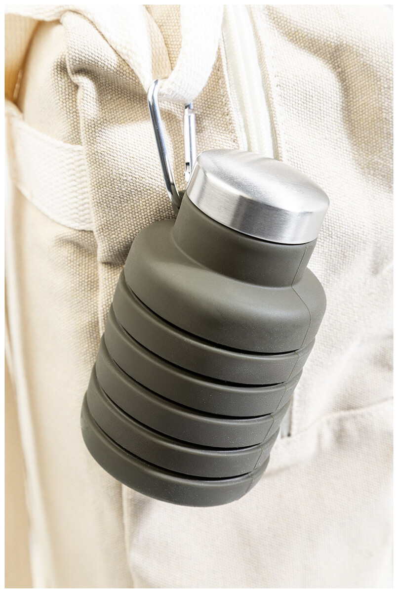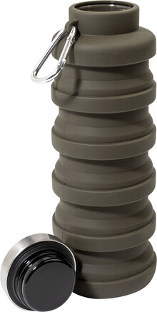 Skládací silikonová láhev s víčkem z nerezové oceli a hliníkovou karabinou. 500 ml