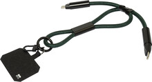 Náramek z RPET s držákem na mobil, vložkou pro telefon, karabinou a integrovaným nabíjecím kabelem USB-C/USB-C se skrytými konektory. Podporuje rychlé nabíjení a přenos dat PD s výkonem 60 W.