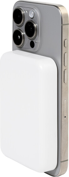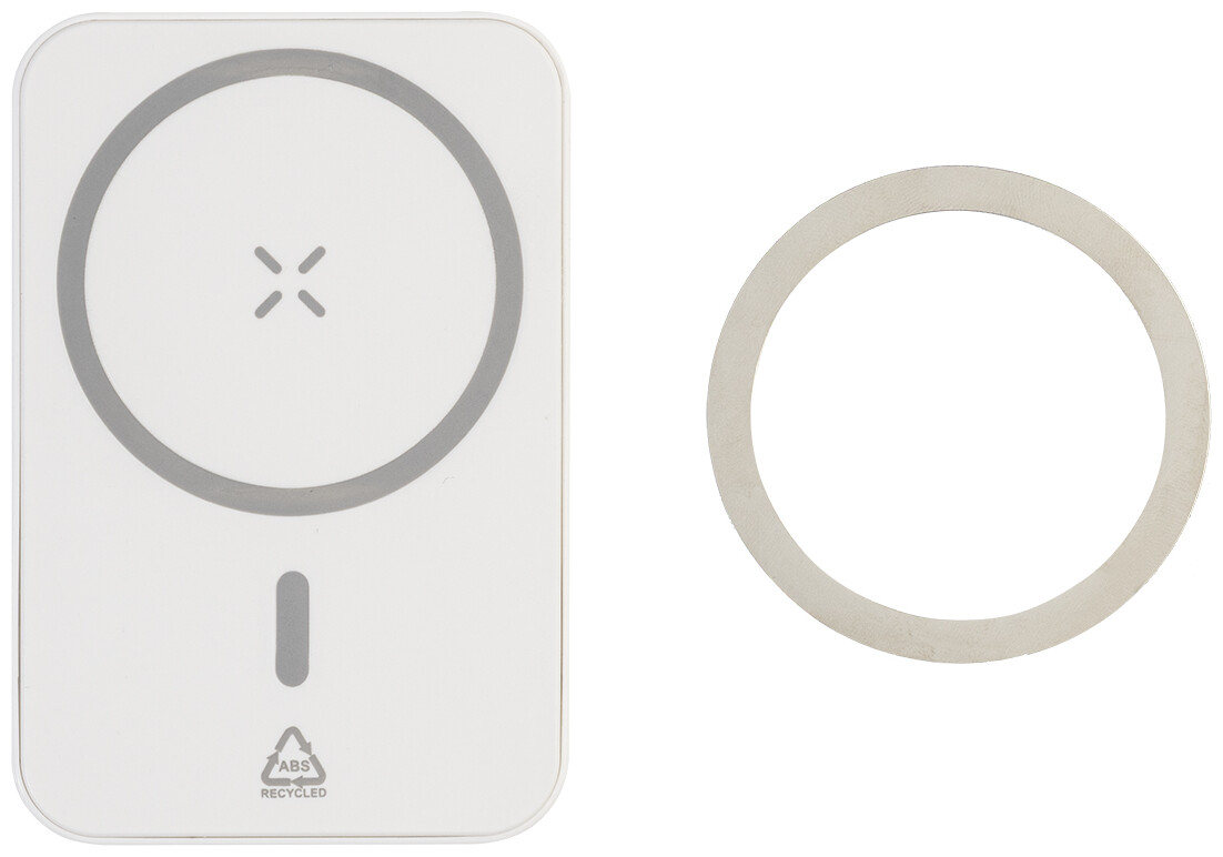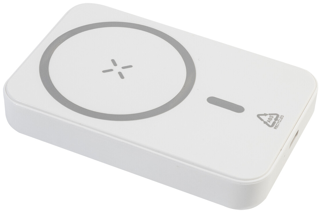 Power banka z recyklovaného ABS s baterií 5000 mAh a vestavěnou magnetickou bezdrátovou rychlonabíječkou (15 W). S USB-C vstupem a nabíjecím portem. Včetně samolepicího kovového kroužku pro použití magnetické funkce na jakémkoli bezdrátově nabíjecím zařízení. Kompatibilní s iPhone® 12 nebo novějším. Včetně nabíjecího kabelu USB.