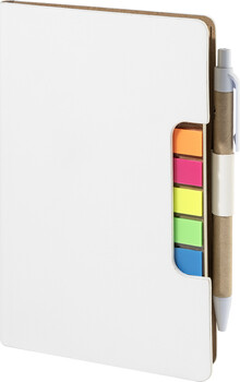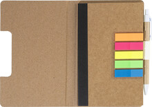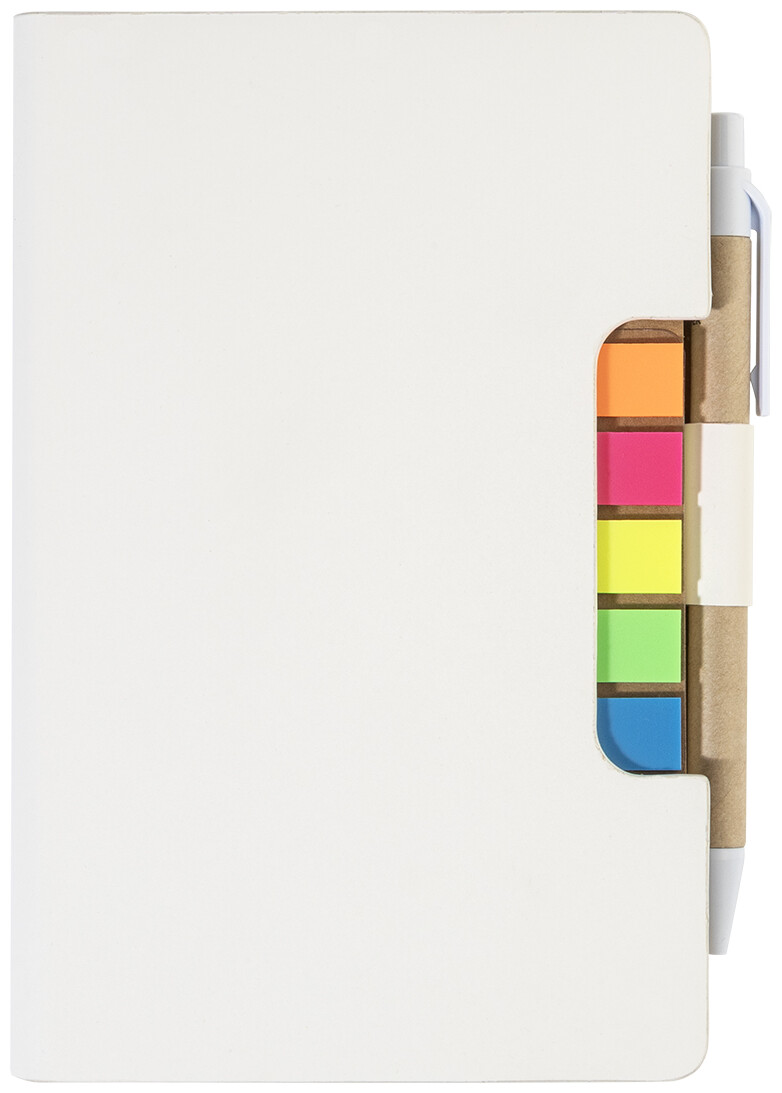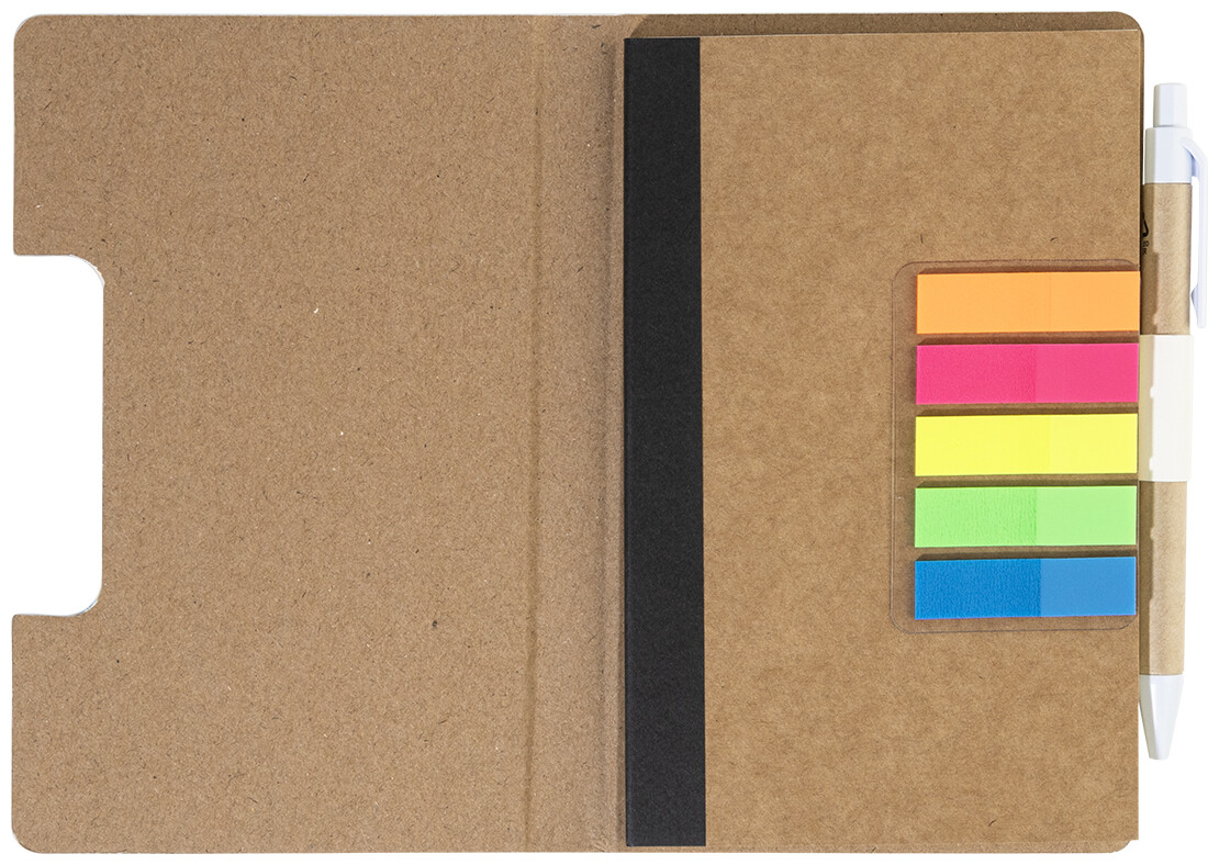 Blok s recyklovanou PU kůží, 70 linkovanými listy z recyklovaného papíru a 125 značkovači stránek (v 5 různých barvách). Včetně recyklovaného papíru a kuličkového pera z recyklovaného PP s modrou náplní.