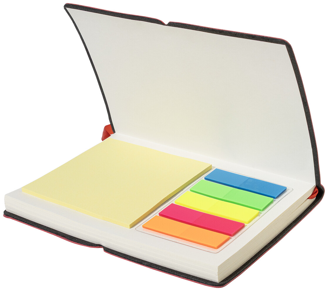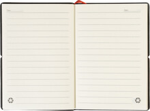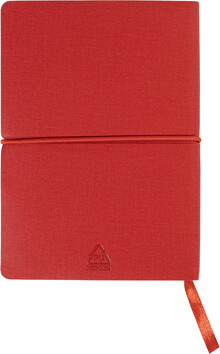 Blok A6 s recyklovanou PU kůží, 70 linkovanými listy z recyklovaného papíru, 25 samolepicími papírky a 125 značkovači stránek (v 5 různých barvách). Se záložkou a horizontálním gumovým páskem.