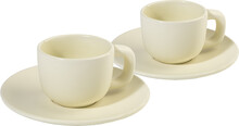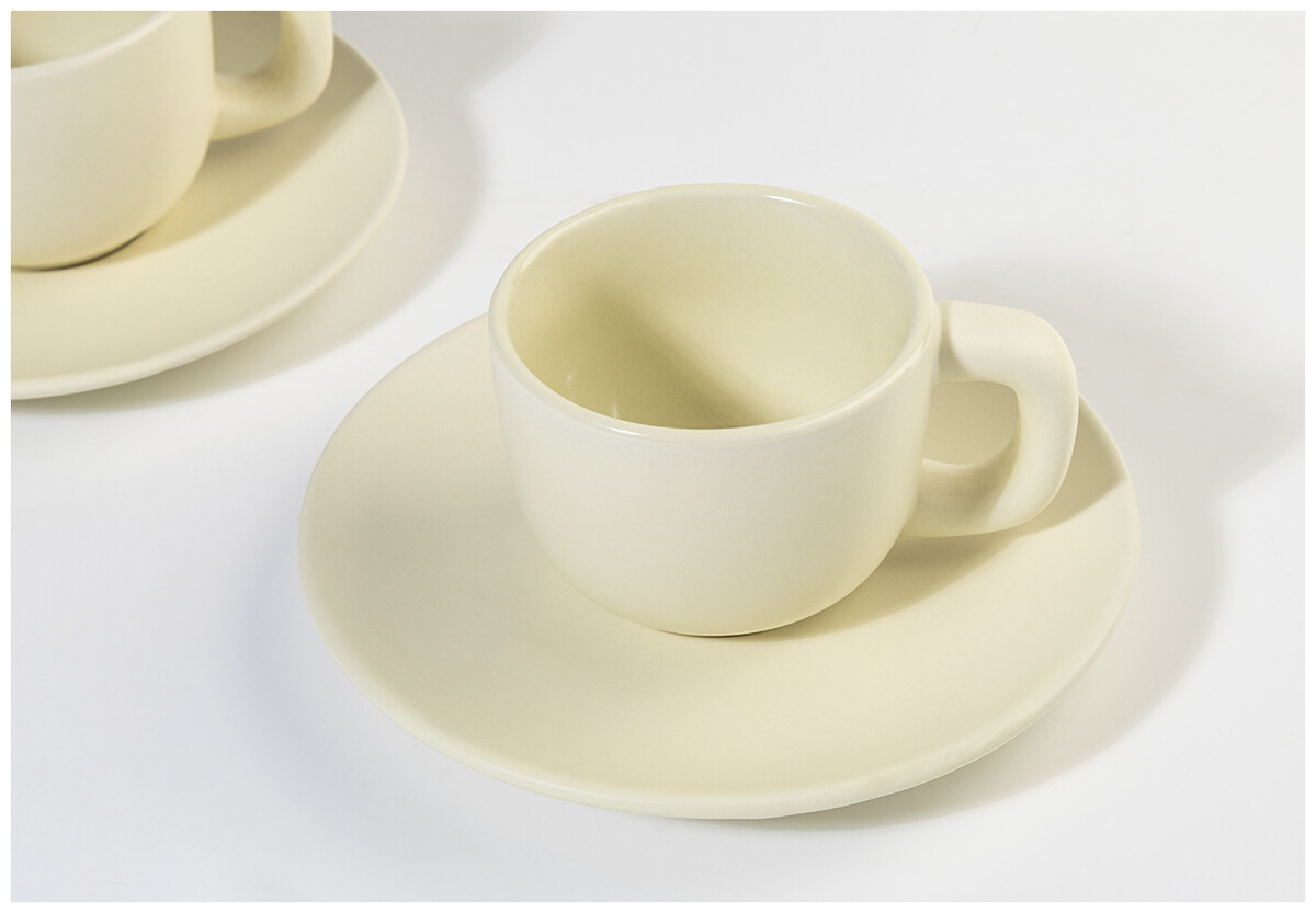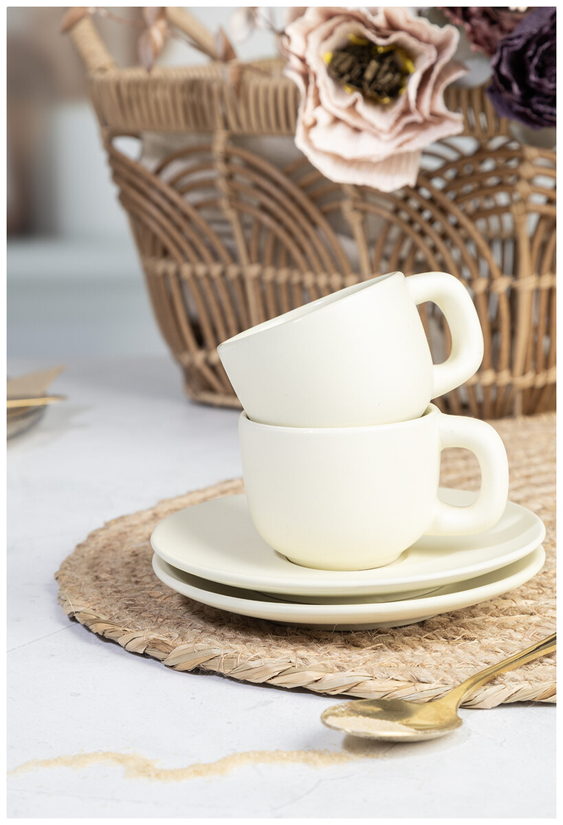 Vysoce kvalitní sada keramických šálků na espresso se 2 šálky a podšálky. S matnou vnější a lesklou vnitřní povrchovou úpravou. 85 ml. V kraftové papírové krabici.