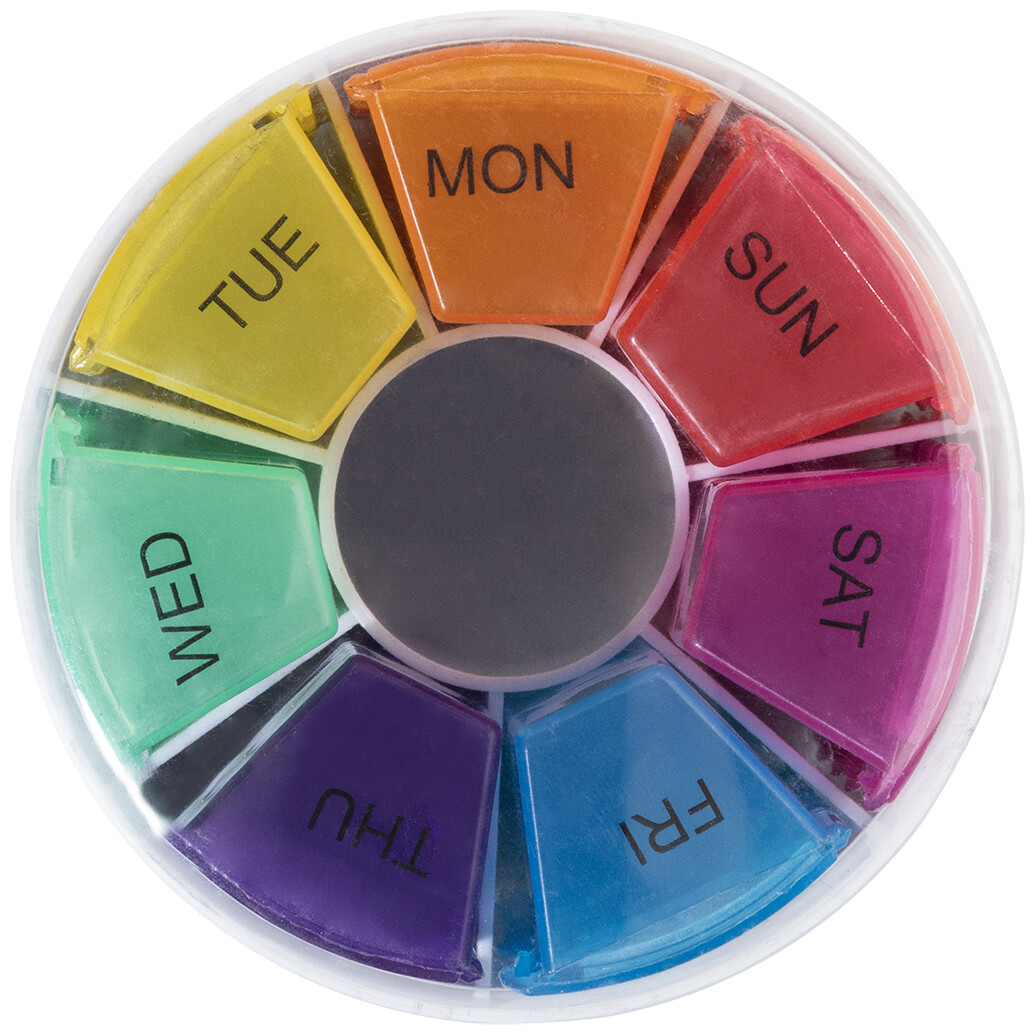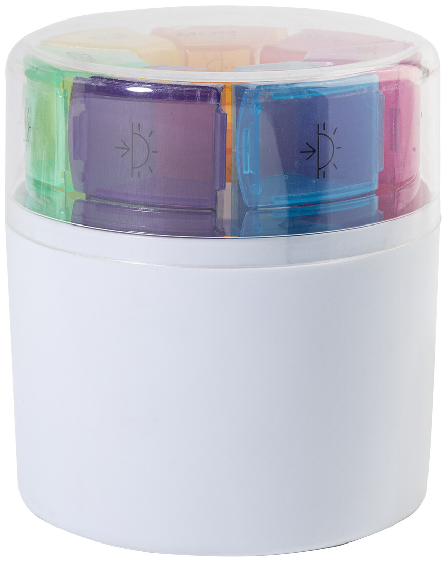 Sada týdenních krabiček na léky z recyklovaného ABS plastu se 7 denními krabičkami, každá se 4 přihrádkami pro různé denní doby. V kulatém stojanu s průhledným víkem.