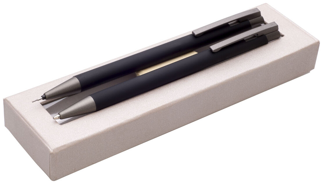 Dárková sada černé propisky a mikrotužky s pogumovaným povrchem a šedými doplňky v luxusním dárkovém pouzdru s průhledným okénkem.