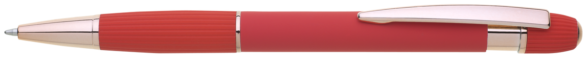 Kovová propiska se soft povrchem a doplňky v růžovo-zlaté barvě. Laserované logo je lesklé, růžovo-zlaté. Náplň modře píšící. Výsledný efekt laserového značení je lesklý, v barvě doplňků.