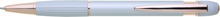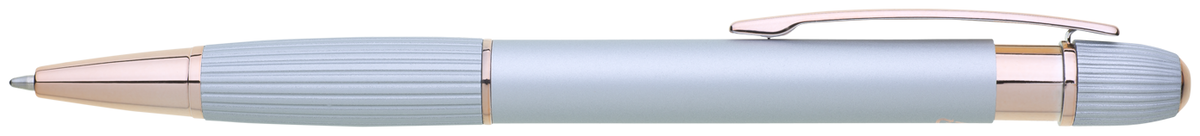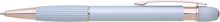 Propiska z recyklovaného hliníku se soft povrchem a doplňky v růžovo-zlaté barvě. Laserované logo je lesklé, růžovo-zlaté. Náplň modře píšící. Výsledný efekt laserového značení je lesklý, v barvě doplňků.