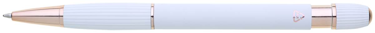propiska z recyklovaného hliníku se soft povrchem a doplňky v růžovo-zlaté barvě. Laserované logo je lesklé, růžovo-zlaté. Náplň modře píšící. Výsledný efekt laserového značení je lesklý, v barvě doplňků.