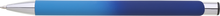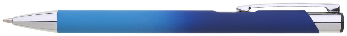 Hliníková propiska se stříbrnými doplňky a měkkým pogumovaným soft povrchem v tyrkysovo–tmavě modrém přechodu. Náplň velkoobsahová, modře píšící.