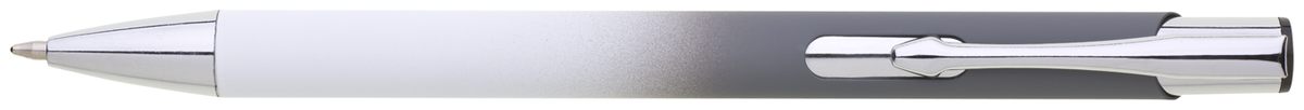 Hliníková propiska se stříbrnými doplňky a měkkým pogumovaným soft povrchem v bílo-šedém přechodu. Náplň velkoobsahová, modře píšící.