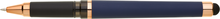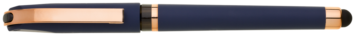 Gelová propiska s s víčkem a touch koncem, soft povrch a doplňky v růžovo-zlaté barvě. Náplň gelová velkokapacitní modře píšící.