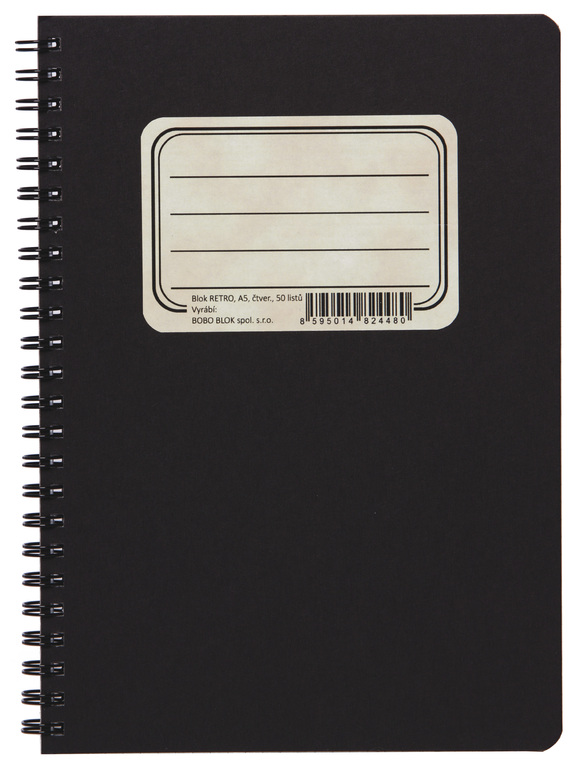 Blok s boční kroužkovou vazbou, tvrdými deskami v RETRO designu, 50 listů. Formát: A5, čtverečkovaný.
